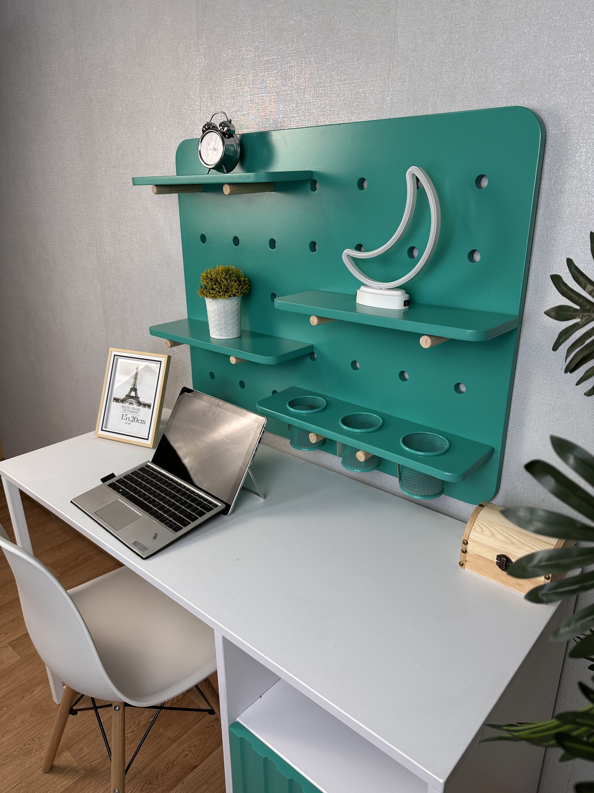 The Colorful Desk with Pegboard is designed to combine productivity with creativity. Crafted from high-quality MDF, this desk features a spacious 120cm by 60cm work surface, providing ample room for a laptop, books, and accessories.