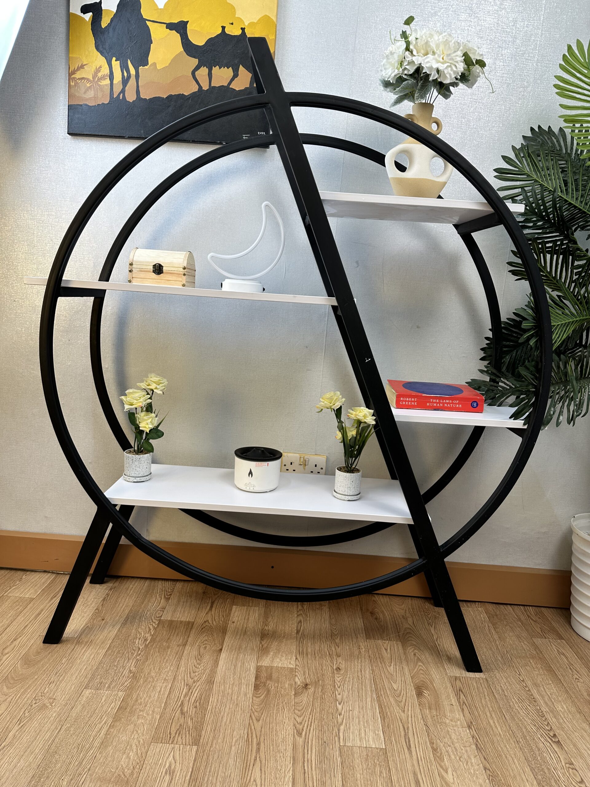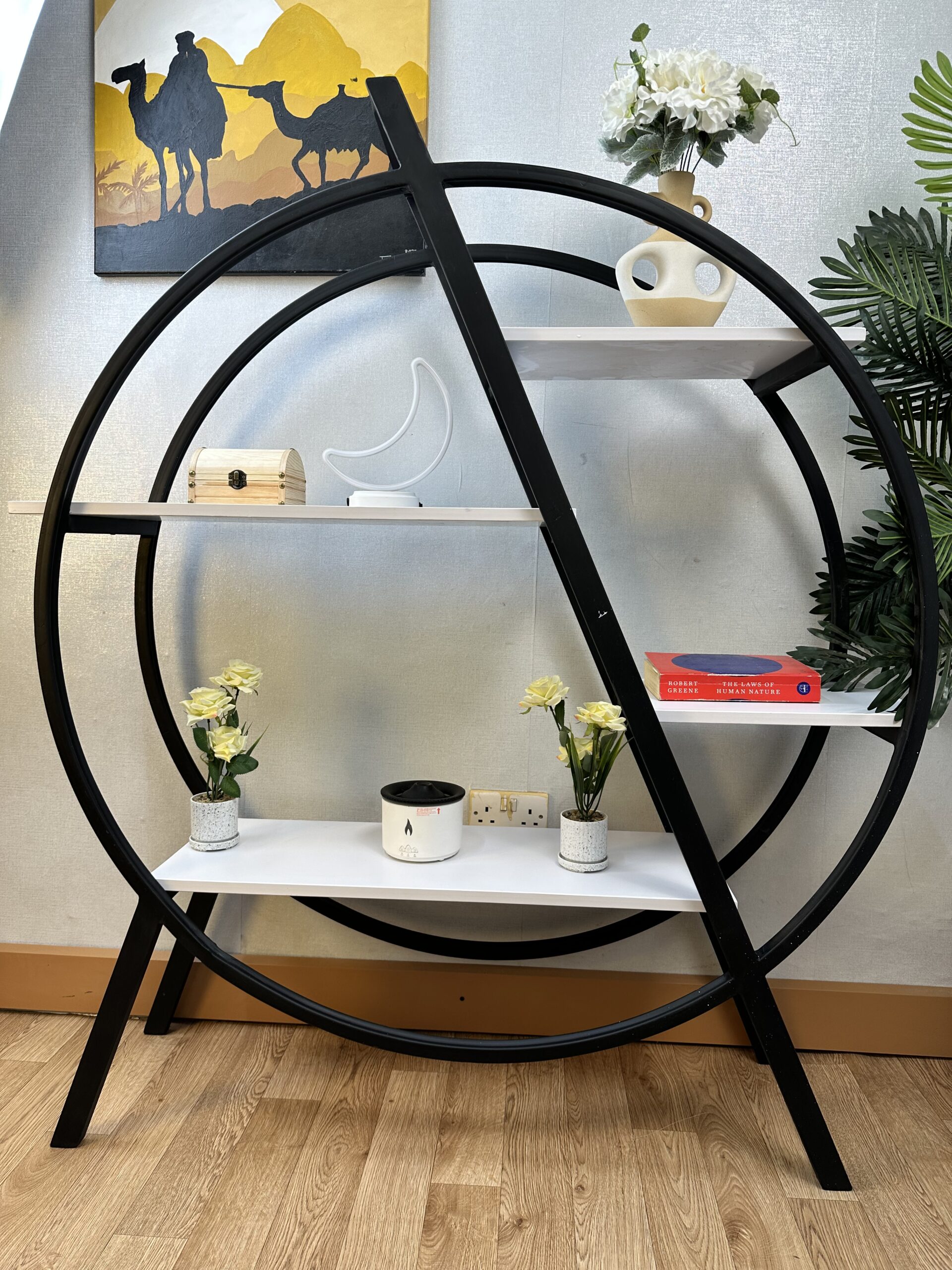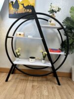 With its balanced 120cm by 120cm structure and 30cm depth, it provides ample space for displaying books, décor, plants, and accessories while maintaining a clean and organized look. The circular metal frame adds a striking visual element, making it ideal for living rooms, offices, and stylish retail spaces.